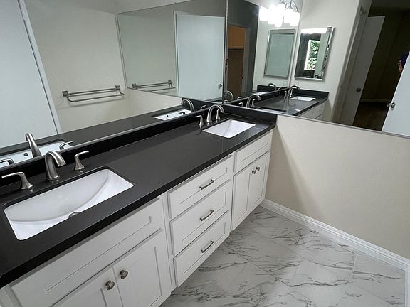 The home features large rooms with tall ceilings and generous storage in the kitchen, hallway, bedrooms, and bathrooms. Each bedroom has a walk in closet and its own full bathroom with updated tubs. The kitchen and baths include modern countertops, luxury tile and marble finishes, and newer appliances. A landlord provided washer and dryer are included in the unit.