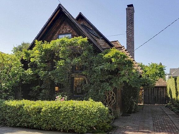 Architecturally significant, this Maybeck-designed house is a refuge with Old World charm. Originally built for Hiram D. Kellogg on Regent Street the house was later moved to this location.The wood-shingled faade is draped in beautiful wisteria and frames the two-story bay window that filters in light without sacrificing privacy. The steeply pitched roof, tall ivy covered fireplace, hip-roofed dormers and cantilevered bays create visual harmony. The interior spaces are open yet well defined and accented by a wall of bookcases, fireplace with built-in seating, unfinished redwood and high, open beamed ceilings. The architect-designed kitchen blends cherry wood cabinets, concrete and butcher block counters, cork floors and stainless steel appliances with superior planning and craftsmanship. French doors in the dining room access the patio with an espaliered fig tree that rests on a shady arbor, a wonderful green screen for hot summer days. In addition to the two bedrooms, a loft-style room can function as an office, playroom or sleeping area. A separate light filled cottage with bath has French doors that open to a well-established garden that provides a connection to nature and a sense of seclusion. Tasteful updates and improvements by the current owners include; built-in TV cabinet, lighting, landscaping, built-in shelves in cottage, wood shake roof and tankless water heater. This very special property is in the coveted Elmwood neighborhood with a 98 from walkscore.com.