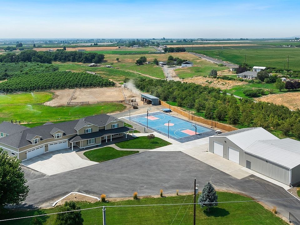 Live your dream in Yakima Valley Wine Country! Nestled in the Rattlesnake Hills AVA, this beautifully designed 5,466 sq ft home offers room to roam and stunning Mt. Adams Views. Perfect for entertaining and multi-generational living, this eco-friendly home features 3 ensuites (one on the main level), 2 additional bedrooms, home schooling/office/craft room, family/game room, and an office with golf simulator capacity. Enjoy peace of mind with a security system, an attached 4-car garage with Tesla charger, and a gated and fenced property. The home includes 40 solar panels, 4,440 sq ft heated shop, indoor RV parking, a full-size lighted sports court, putting green, and horse/livestock setup. Set on 5.5 acres, this is a tremendous opportunity.