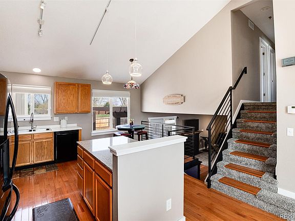 The main level welcomes you with an open-concept kitchen and dining area featuring plentiful cabinet space, generous countertops, and a vaulted ceiling that enhances the home's airy feel. A large front window fills the space with natural light, while newly installed wrought iron railings provide a modern, open look and overlook the lower-level family room. On the lower level, enjoy a cozy gas fireplace and direct access to the spacious backyard patio, complete with a pergola—perfect for outdoor entertaining.