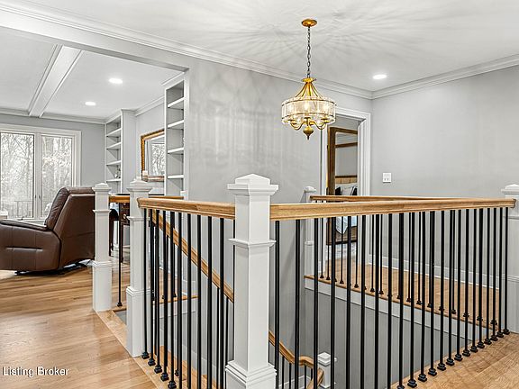 The first floor boasts gorgeous light wood hardwood floors that flow seamlessly through the expansive living room, where grand windows frame the breathtaking views of the lush front yard. The living room opens into a formal dining area that leads into a chef's dream kitchen. The custom cabinetry, oversized island, top of the line appliances and an abundance of natural light pouring in from the windows overlooking the wooded backyard make this space ideal for both everyday living and entertaining. adjacent family room is equally impressive, featuring a brick fireplace and built-in shelving, creating a warm and inviting atmosphere.