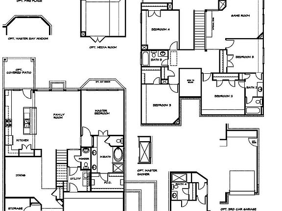 The Garner III plan has 5 Bedrooms, 3.5 Baths, Study, Formal Dining Room, Breakfast area, Kitchen is open to Family Room, Master down, Gameroom up, and Covered Patio.. Optional Guest Suite with full Bath, Bay Window at Master Bedroom, Master Super Shower, Fireplace, or Media Room available.