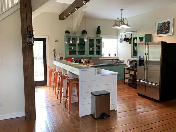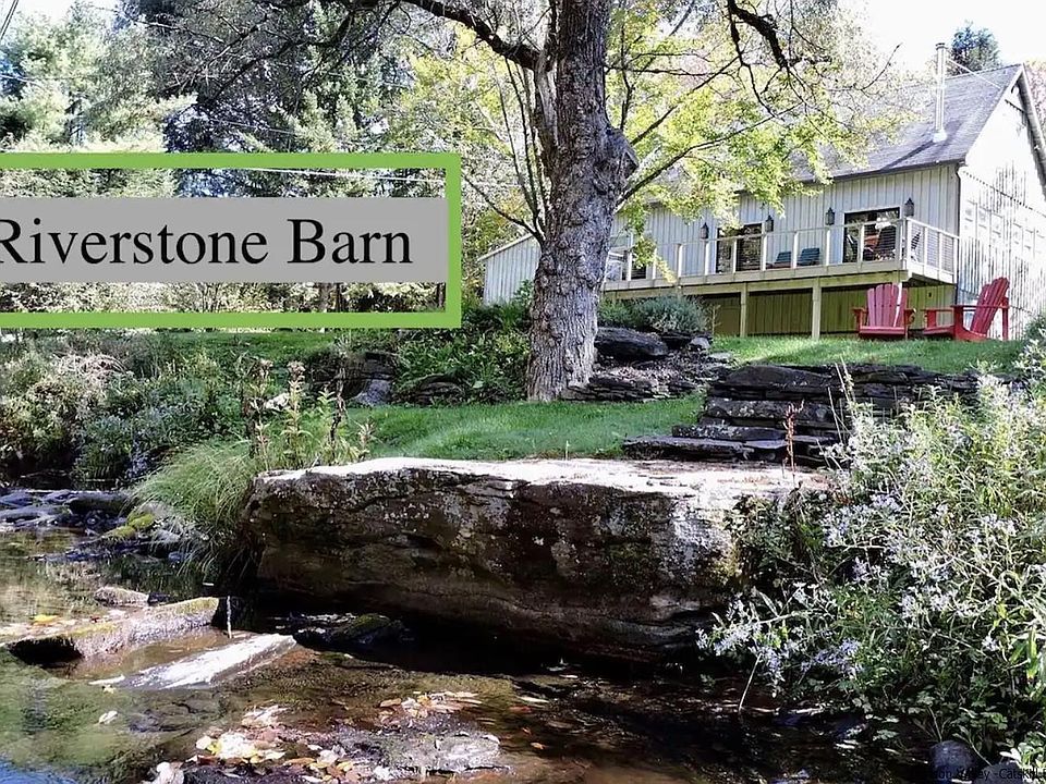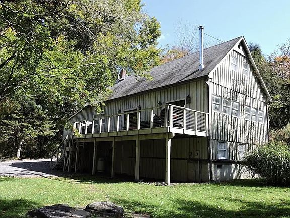 Historic Converted BARN with EXPOSED BEAMS. STREAM SIDE with PRIVATE SWIMMING HOLE right in your backyard. Wood-burning fireplace in living room. Original WIDE Plank wood floors throughout. Blue stone spa shower with copper fixtures. OPEN PLAN layout with easy entertaining access, indoor outdoor to huge deck overlooking the Batavia Kill Stream. Incredible FLEX room waiting to be finished to a 3rd bedroom and extra bath. Spray foam insulated Full walk out BASEMENT with windows and double doors. Successful rental income AirBnB property. ROOM TO EXPAND. Mature landscaping, full basement with private coded entrance and double doors opening onto the property. Minutes to Skiing at BELLEAYRE, close to shopping and 5 star restaurants. Very special property.