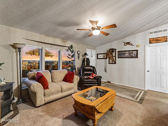 Breathtaking hilltop views! This secluded 2-acre lot home offers some great outdoor spaces. The front deck comes complete with outdoor furniture and endless city and mountain views, while the back deck offers a more private experience and includes a BBQ and outdoor heater! Walking into the home you will find vaulted ceilings, more views and a cozy pellet stove. Beautiful brown leather reclining couch, loveseat and recliner and tables convey (not pictured). The spacious kitchen has newer (1 year old!) black stainless-steel appliances (2 refrigerators) including a gas stove , a freezer, newer RO & hardwater systems with an eating nook for those informal dinners, decorative shelving,