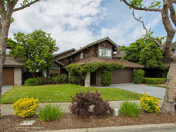 Built in 1989, the entry to this contemporary Brown Shingle home is enhanced with mature, flowering plants and a covered walkway that leads to elegant oak and beveled glass dual front doors. Decorative stone pillars give the walkway a substantial, rustic feel, while the stone contrasts beautifully with the colorful roses that grow next to the entrance and the abundant scarlet bougainvillea that trellises the walkway. Once inside, the large, marble-floored foyer opens to a bright, open-concept floor plan that offers functional yet elegant living with stunning views of the San Leandro Channel, Oakland hills, Bay Bridge, San Francisco and beyond. The large radius window over the front doors lends softness and plenty of light to the area, and the cathedral ceiling and clean, open lines creates a feeling of warmth and drama. To the left is a spacious formal living room accentuated by high ceilings, arched clerestory windows and French doors that open to the lovely back garden/patio that faces the water and enhances the panoramic view. To the right of the entry are the formal dining room, kitchen, family room, main level bedroom, full bathroom, laundry room, and garage access. The formal dining room, adjacent to the kitchen, has French doors with sidelights that show off the landscaped, curving herringbone-pattern brick walkway. The room is large enough to easily accommodate a group of guests for more formal dining. The wonderful kitchen/family room is perfect for casual entertaining, or just enjoying the spectacular view. The chef’s kitchen has beautiful and functional Silestone quartz countertops throughout, top-of-the-line GE Profile satin stainless steel appliances (including double ovens, one of which is convection), a Bosch dishwasher, a Thermador five-burner gas range, plenty of cupboard and cabinet space for storage, an oversized sink, and a counter for casual meals or food prep. All of this is just steps from the breakfast nook and a family room that feature an entire wall of windows, allowing unobstructed views of the Channel, Bay and San Francisco. Sliding doors open to the tiered vegetable garden and herringbone-pattern brick patio perfect for outdoor entertaining and watching sunsets over the Bay. An oversized wood-burning fireplace (including a separate area to store firewood) with a marble surround and raised hearth completes the room. Also on the main level is a bedroom with a large window and ample closet space. A full bathroom right across the hall makes this bedroom perfect for a guest or au pair, or used as an office. Directly next to this bedroom is a full laundry room, with built-in upper cabinets for storage. The expansive master suite is on the home’s upper level, and features San Francisco, Oakland, and Bay Bridge views (with a peek of the Golden Gate Bridge in the distance!), and a private redwood deck, partially encased within a glass solarium for the use of the master bedroom. The two deck spaces allow for enjoyment on warm, summer days outside or protected within the solarium for an opportunity to still enjoy the outdoor surroundings even on colder days. The master suite boasts cathedral ceilings, a walk-in closet off of the master bath, a wood-burning fireplace, and is spacious enough for a separate seating area. A large, en suite master bath has an oversized, twin-sink vanity with quartz countertops, plenty of storage beneath, and practical porcelain floor tiles that resemble marble. There is a separate water closet and a striking, glass-enclosed shower tiled with a white subway tile surround and a Carrara hexagonal tile floor. A contemporary, stand-alone, white soaking tub sits dramatically in front of the panoramic picture window to complete this dramatic, spa-like room.