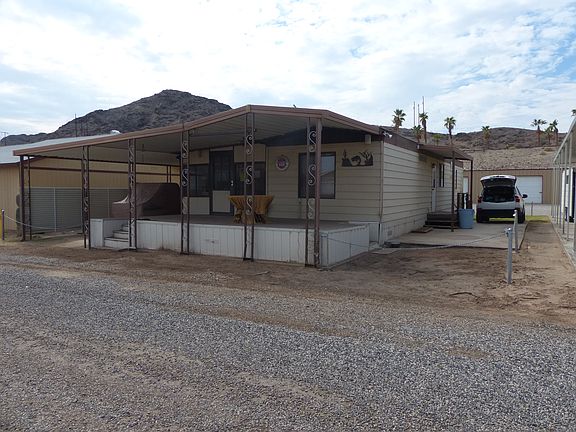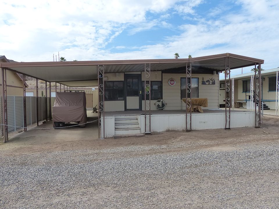 Tired of towing your toys back and forth from the river? Here's the cure! This is the river house you've been looking for! Located at Water Wheel resort on the Colorado River, exactly halfway between Blythe and Parker on the California side, 24 miles north of Blythe. This is a great family park, not a party place like Parker but you certainly won't get bored either. Great water for boating, skiing, 18 miles of some of the best glass water on the river. Plenty of sandy beaches and sandbars to visit. Fishing is great year around. Wide open desert for getting your off road toys dirty in the winter time. The park is well maintained, has 2 excellent beaches, private launch ramp, 2 fuel pumps and a convenience store on the premises. No RV parking or camping at the park, so you always know who your neighbors are. Double wide mobile home, 56 x 24, 2 bedrooms plus a bonus room. Large living room and master bedroom, big walk-in closet in master. Separate dining room with built-in storage and display cabinets. Master bedroom is at the opposite end of the house from the extra bedrooms. Ceiling fans in every room. New roof installed 2 years ago. Updated plumbing. In ground sprinklers if you want to plant a lawn. Great big, 12 x 24 covered deck in front with built-in speakers for enjoying the evenings from. Fully furnished and equipped; brand new furniture in master bedroom and living room. Non-smoker. 12 x 68 awning covered carport on one side, and open parking on the other side. Storage in the rear for parking the smaller toys or golf cart. Room for lots of toys. Located on a semi-private lot, there are only neighbors on one side. The lot is an extra large lot measuring approximately 50 x 80. Water Wheel Resort is one of the nicest parks on this stretch of the river. The lot is a yearly lease, the space rent is $420 a month. This includes water, trash, sewer and full use of all the park amenities.