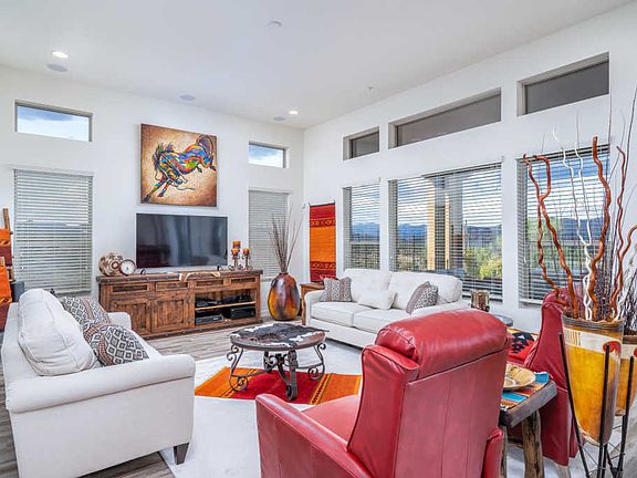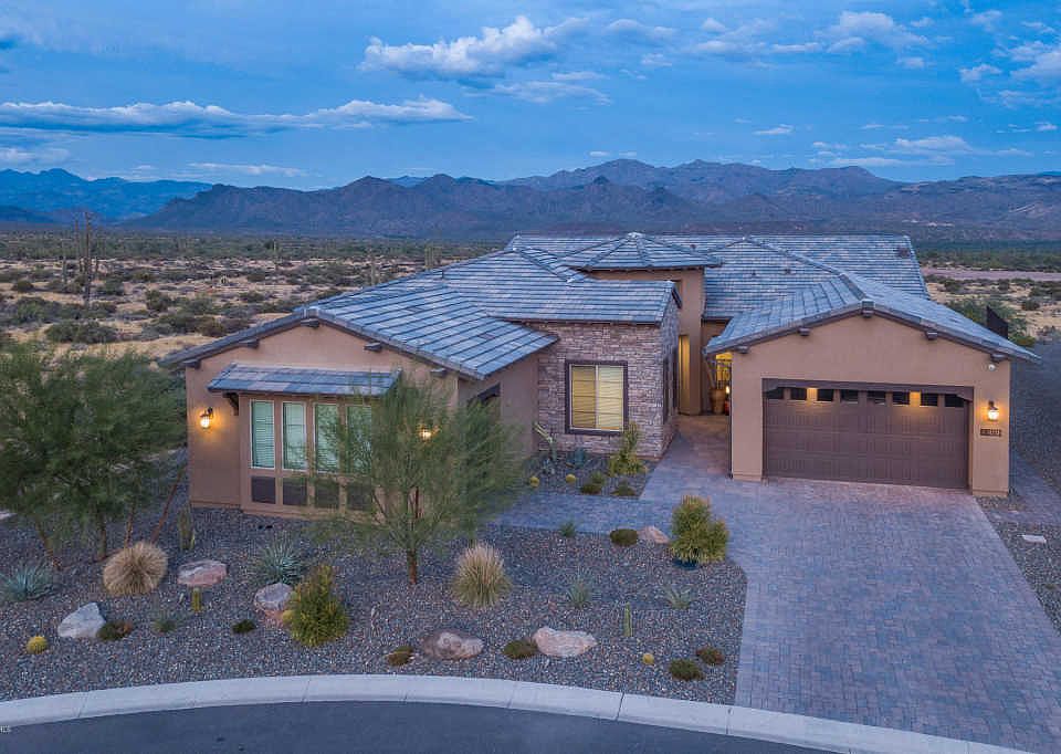 Luxury living awaits you in this absolutely stunning 3 beds + den and 3.5 baths 3,139 sqft home in the resort-style guard-gated community of Trilogy at Verde River. Private cul-de-sac lot with no rear neighbors, just breath-taking desert and mountain views. Open concept living in this unique Stellare floor plan (only 3 built in the community) with spacious great room layout with tall ceilings, wood-look tile floors, neutral paint, and tons of windows for extraordinary lighting and mountain views. Curved wet bar with dark quartz countertops, white cabinetry, and wine fridge, perfect for entertaining. The gourmet kitchen features an abundance of white 42'' oak cabinetry, quartz countertops, stainless appliances including a gas cooktop w/range hood and wall oven, kitchen island with breakfast bar seating, RO system, and unique floor-to-ceiling accent tiled wall. The carpeted master retreat includes tray ceiling detail, recessed lighting and an attached spa-like bath with separate vanities, makeup area, soaking tub with tile surround & window views, walk-in shower w/ bench seating, and an enormous walk-in closet with plenty of storage options. The backyard is perfect for outdoor living with extended covered tiled patio, sparkling heated pool w/ spill-over spa, turfed area, built-in BBQ island, mature citrus trees, additional secluded side patio and view fencing for an uninterrupted mountain backdrop. Other features: 2+ 1 car garage with epoxy floor & service door, ensuite bathrooms in the 2 secondary bedrooms, upper/lower cabinetry & sink in the laundry, powder room perfect for guests, water softener, alarm system, central vacuum, and unbeatable community amenities including golf, resort-style pools, tennis courts, restaurants, bocce ball, community center, fitness center and SO much more! Also be sure to inquire about furnishings available on separate bill of sale. See this home today!