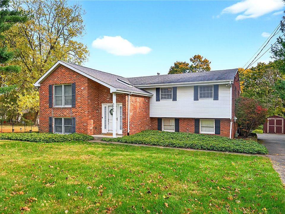 Move-in ready home! This updated 4-bed, 2.5-bath split-level sits on over a ½-acre private lot with a peaceful, tree-lined yard. The spacious eat-in kitchen features quartz countertops, stainless appliances and recessed lighting. The open layout flows from the sunlit living room to the dining room, plus an amazing family room with vaulted wood ceiling - a true wow factor! The primary suite offers an en-suite bath and generous closets. The lower level includes a cozy game room with brick fireplace, a large fourth bedroom, laundry area, and access to a two-car garage. Enjoy outdoor living on the side deck or the Zen-like patio off the game room. Conveniently located near schools, shopping, grocery stores, and Turnpike access, this home blends comfort, space, and top-rated location!
