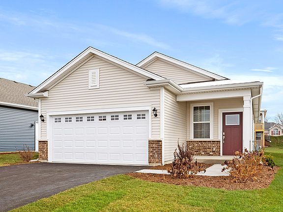 Envision yourself at 2966 Harnish Drive in Algonquin, Illinois, a beautiful new home in our Grand Reserve Algonquin 55+ community. This ranch home is ready for an immediate move-in! Scenic homesite backs to open space and includes fully sodded yard and covered back patio. This Avery plan offers 1,412 square feet of living space with 3 bedrooms, 2 baths, and 9-foot ceilings. Enjoy the Avery's open concept great room and kitchen. The kitchen layout includes a large island with an overhang for stools, 42-inch designer flagstone cabinetry with crown molding and soft close doors and drawers. Additionally, the kitchen features a pantry, modern stainless-steel appliances, quartz countertops, and easy-to-maintain luxury vinyl plank flooring. Enjoy your private get away with your spacious primary bedroom and en suite bathroom with a raised height dual sink, quartz top vanity, and walk-in seated shower with ceramic tile walls and clear glass shower doors. The location can't be beat, within proximity to all of the everyday conveniences that Randall Road has to offer! Shopping, dining, and entertainment are all within minutes. If you enjoy walking, take a stroll over to the Algonquin Public Library or enjoy a scenic walk on the stunning nature preserve walking trails! All Chicago homes include our America's Smart Home Technology which allows you to monitor and control your home from the comfort of your sofa or from 500 miles away and connects to your home with your smartphone, tablet or computer. Home life can be hands-free. It's never been easier to settle into new routine. Set the scene with your voice, from your phone, through the Qolsys panel which you can schedule it and forget it. Your home will always await you with your personalized settings. Our priority is to make sure you have the right smart home system to grow with you. Our homes speak to Bluetooth, Wi-Fi, Z-Wave and cellular devices so you can sync with almost any smart device. Builder Warranty 1-2-10. Exterior photo of actual home, interior photos of similar home, actual home as built may vary. Landscaping not yet installed.