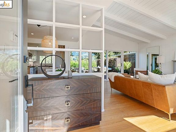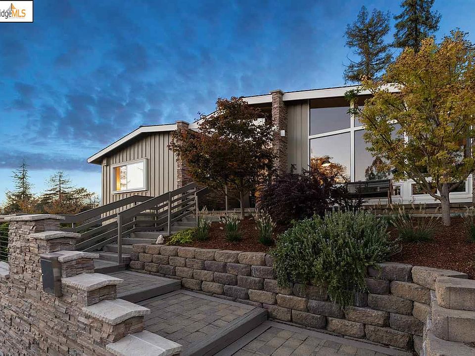 Redesigned mid-century with partial bay views. Once featured on HGTV "Curb Appeal"! Situated on friendly cul-de-sac. Modern open floor plan w/vaulted ceiling in living room, oversized glass windows & doors that create an ideal indoor/outdoor living space. Living room & kitchen open to large private deck. Entertain and dine under the stars. Cozy fireplace w/Heath tiles in living room and period wood panel detailing. Newer eat-in chef's kitchen & dining area. Master bedroom suite and 2 additional bedrooms on main level. Original random plank hardwood floors. Lower level has additional family room, storage and garden access with sandbox and level patio. Professionally landscaped yard with 2 stunning maples. Large two car garage with interior access. Convenient location. Minutes to downtown, Montclair, farmer's markets, East Bay trails and top rated schools. Enjoy all city amenities and come home to your own private retreat!