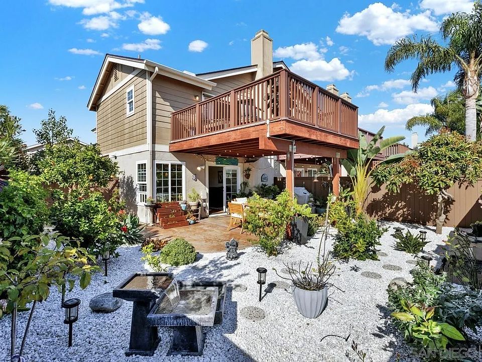 Back on market, buyer could not perform and lost their earnest money. No fault of the property. Oversized deck, which leads through French doors from the primary suite, offers ocean views, city lights and bright southern exposure! 2nd bedroom has a full bathroom en suite. Both bedrooms have soaring vaulted ceilings. Decorated with designer colors and luxuriously remodeled primary bathroom sports a jetted tub and glass block to optimize light and reflect sunset and sunrise colors. Remodeled kitchen is complete with trey ceiling, pendant lighting, granite countertops and stainless steel appliances. Bamboo floors throughout bedrooms and living areas with, travertine tile in kitchen and bathrooms. Cozy fireplace in living room, for those chilly/romantic nights! Bonus half bath downstairs! Windows are Milgard dual pane, water heater and water pressure regulator are newer. 2 car garage has tons of storage space with overhead organizers and epoxy floors! Dryer can be gas or electric. Close to Carlsbad's best schools, the Calavera Hills community park, and nature reserve hiking trails! Approximately 3.5 miles to the beach! Relaxing, no maintenance backyard sanctuary that features mature, tangelo and avocado producing trees. Fountains in backyard for sale for $1,500 for both. Washer and dryer for sale for $500 for both.