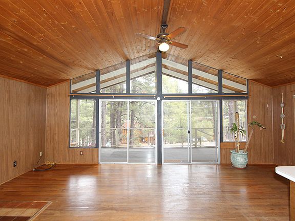 Just minutes from downtown Flagstaff you can enjoy peaceful views of the pines, take in the stars, or go for a walk in the worlds largest Ponderosa Pine Forest. This 3 bed 2 bath home features tongue and groove ceilings, an open kitchen, wood floors, and a wall of windows to let in that natural light. Situated on one of the bigger lots (16,553 sq.ft.) in Kachina Village and located on a cul de sac! There is a large area below that can be used for storage, parking or potentially finished for living space. Kachina Village is just 7 miles south of Flagstaff and offers endless hiking trails, a community park, general store and more.