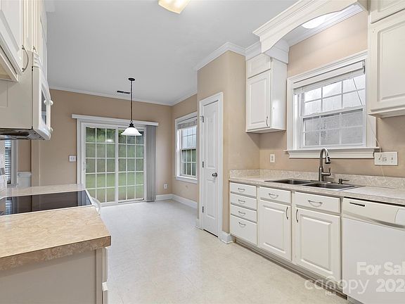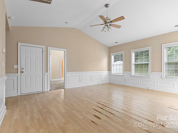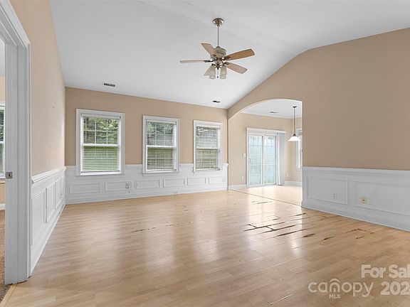 Nestled in a quiet Riverwalk neighborhood, this 3 beds, 2 baths charming home in Concord, NC offers a perfect blend of comfort and style. Step inside to discover a split bedroom plan bathed in natural light, featuring soaring 9 ft. ceilings and exquisite custom woodwork throughout. The living room and bedrooms boast elegant vaulted ceilings, creating an airy and spacious feel. The primary suite is a true retreat, complete with a generous walk-in closet, a walk-in shower, and a relaxing garden tub. The eat-in kitchen is a chef's delight, showcasing white cabinets, crown molding, and ample space for meal preparation and dining. Outside, the fenced backyard provides privacy and a secure space for outdoor activities. A convenient storage building is included, offering extra room for all your belongings. Located just minutes from I-85 and I-485. Needs a little TLC.