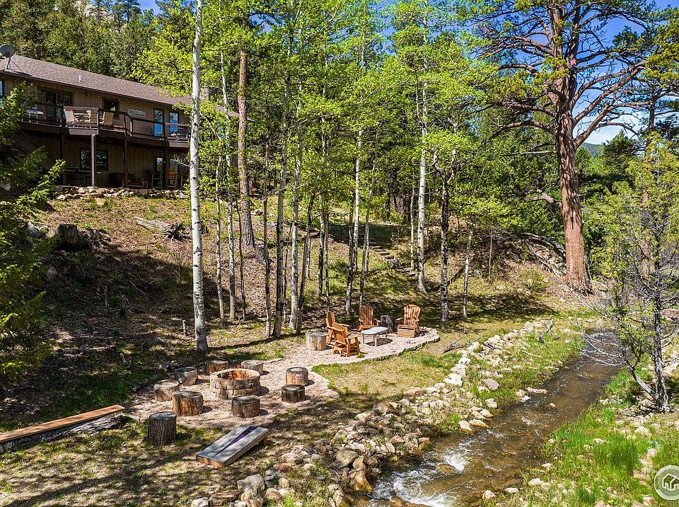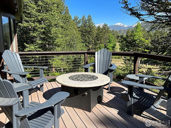 Welcome to this mountain modern paradise in Estes Park! A remarkable home and unique property with a rare combination of privacy, convenience and unsurpassed outdoor living areas that will take your breath away. With over 3 acres of land nestled among the aspens and featuring snow-capped Rocky Mountain National Park views, you'll have plenty of places to relax and soak in the incredible surroundings. Multiple decks and patios provide lovely entertaining spots, as well as private areas to relax and unwind, while enjoying the sounds of the rolling water from the creek. Step inside and you'll be greeted by a sunny and inviting open floor plan. The living room offers comfort along with high peak views of the surrounding mountains, creating a truly awe-inspiring experience. This home is filled with beautiful features, finishes and every window offers natural light & stunning views. This property is a very special spot in Estes Park, a rare opportunity as it has only been on the market twice in the past 40 years and is the first home available for sale in the coveted Centennial Hills area in years.The spacious living space boasts a vaulted ceiling with beetle kill wood beams & large picture windows that showcase the natural beauty. The gourmet kitchen features high-end stainless appliances, induction cooktop for those who love to cook, hickory cabinetry and solid quartz countertops. The main level also includes a lovely primary bedroom with a custom walk-in closet and a private bathroom. A 2nd bedroom & large full bathroom complete the main level. The lower walkout is a delight for those that enjoy family fun or entertaining. A great room awaits with an upgraded fireplace, outdoor patio access and custom bar. 3 additional bedrooms, one with an attached 3/4 bathroom, provide ample space for guests or a growing family. Lower level also features a large laundry & storage space, old school laundry chute included and a home gym with storage, full bathroom and 3-car garage.