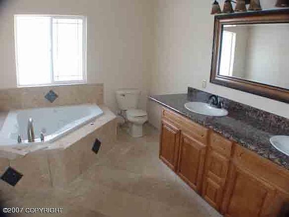 Brand spankin new and fit for a King of the Last Frontier, this house has got it all! 2,300 sqft, 3 bed, 2 bath, solid Granite slab countertops, in-floor heat, wrap around decks, vaulted ceilings, great commute location and amazing Travertine floors in the kitchen and bathrooms and a large bonus room.