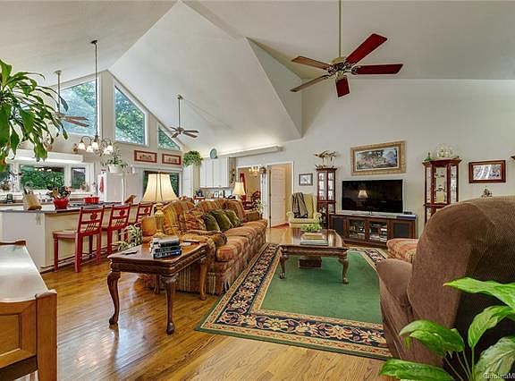 Enjoy life in the mountains while sitting on the back screened porch, watching golfers play the 13th hole at Rumbling Bald Golf Course with a view of Rumbling Bald Mountain! Very open main level features a large open plan: great room with gas fireplace, kitchen and dining area all under a cathedral ceiling; formal dining room; large master bedroom with walk-in closet, vanity and bath with glass block enclosed shower; nice second bedroom and full bath; dining area and master bedroom both access the full-length deck at the front of the home - gives a treehouse feel! Entry foyer is at basement level with a "grand staircase" to the main living area. Basement also includes a spacious office and a rec room with full bath. The drive-under garage was designed for three cars, so storage is no problem - and theres a workbench and utility sink. AND, there's a dumb waiter to get your purchased goods from the car to the living area. Central vac is a definite bonus!