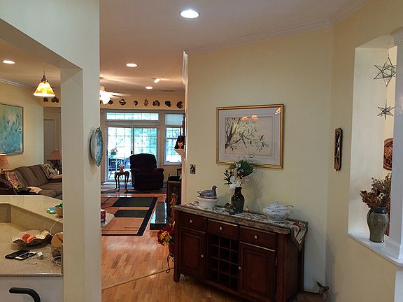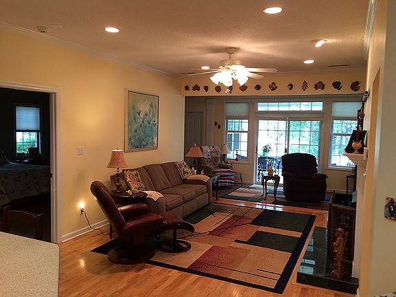 Beautiful 1900 square foot home is located in Deerlake Village. Three bedroom two bathroom split floorplan home has hardwood flooring throughout, with tile in kitchen and bathrooms. Brick flooring in transition between the living room and rear covered patio. Large master suite with his and hers closets. Master Bath features whirlpool tub, tiled walk-in shower, double sinks, make-up area and raised toilet. Living Room has a gas fireplace with remote control. Fireplace features a marble surround and hearth with decorative mantle. The formal dining room with two windows is located directly across the foyer from the kitchen. Kitchen features upgraded countertops, lots of storage, and breakfast area with open view into the living room. Appliances included are: Refrigerator, Gas Stove, Microwave, Dishwasher, Disposal, Washer and Dryer. Double car garage with electric door opener, utility sink, workbench, storage cabinets and shelving. Brick front porch. Rear covered patio with paddle fan. Beautifully landscaped with easy access into home.