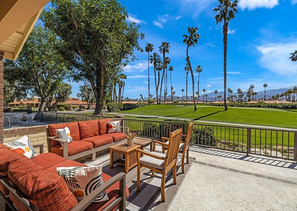 SELLER IS MOTIVATED - BRING ALL OFFERS!!! Stunning golf course home boasts southern mountain views that will take your breath away! Newly renovated kitchen features white shaker cabinets, quartz countertops, marble backsplash, and stainless-steel appliances. Bright, airy living spaces with vaulted ceilings lead to three spacious bedrooms and two bathrooms, including a primary suite with an updated shower and large walk-in closet. Recent upgrades include a HVAC system, fresh paint, new solid shaker doors, base moldings and carpeting. The expansive patio overlooking a meticulously maintained tabletop green, serves as the perfect backdrop for gatherings, offering an idyllic setting for enjoying the beauty of the golf course and the surrounding mountain vistas. This home is just steps away from resort-like amenities at Monterey Country Club which includes a27-hole Ted Robinson designed course, 20 pickleball courts, Tennis Courts, 4 new Bocce courts, a fitness facility and clubhouse. HOA fees include premium cable (Showtime and HBO), internet, trash and security gate with 24 hr guard house. Embrace the opportunity to make this stunning golf course home your own and begin your journey in the relaxing, desert lifestyle.