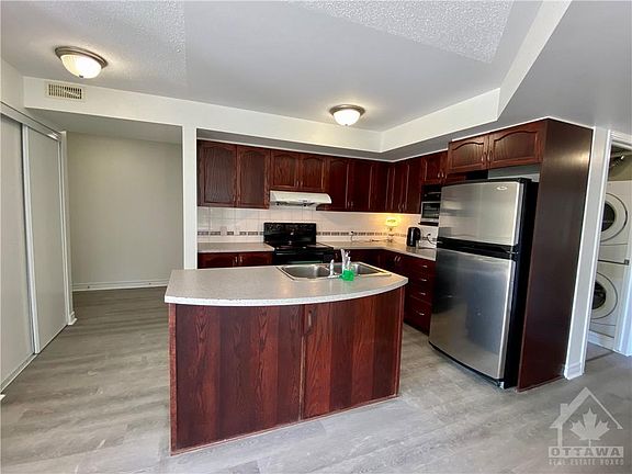 GREAT LOCATION in Barrhaven! Right across the street from all amenities and close to Rideau River walking trails. Walking distance to public transit, schools and parks...This Minto 2nd floor END UNIT offering 2 Bedrooms +1 Den with door +1.5 Bath, 1095 sq.ft condo flat, very SPACIOUS! The OPEN-CONCEPT kitchen features a large center island and plenty of cabinets. Sunny dining room and living room features 3 windows on two sides and a patio door opening onto a bright south-facing balcony. The full main bathroom features a tub with shower, a window and lots of counter space. Convenient powder room is just outside the good-sized den. This unit has been freshly painted and equipped with stainless steel fridge, new Mircowave, Central A/C, dryer/washer In-suite laundry and storage. Brand New laminate flooring throughout in Kitchen, living/Dining, all bedroom, den and hallway. Nice cozy and move-in ready. Call it home or for investment, Quick closing, don't miss it!