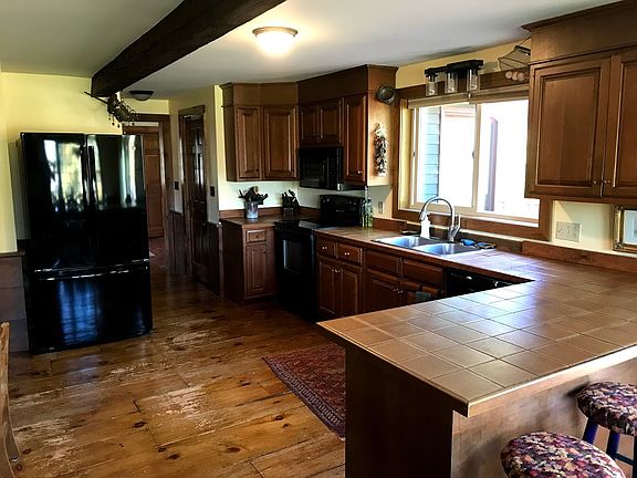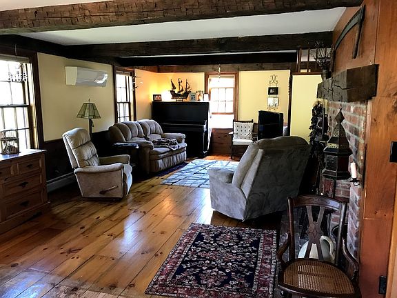 Beamed ceilings in this reproduction Colonial beauty with newly-finished stunning wood floors and bedrooms up and down. Open-concept space from kitchen to dining space to living room on the stylish and functional 1st floor with a full bath and bedroom. Kitchen with floors restored to perfection, breakfast bar, walk-in pantry, sweet dining space with bay window and sliders to the deck area. Slider door & kitchen window (custom, both Pella) and kitchen lighting are all new. Bricked fireplace and beams beacon anyone to relax and stay a while. Gigantic great room in rear (can't be seen from the street) is a fantastic surprise with brand new carpeting, vaulted ceilings, skylights, and beamed construction. Master bedroom and closet are quite large. 3 bdrms and 1 full bath on 2nd floor. Bone dry and easily finishable basement offers work area and loads of superb storage space. Excellent garage, great grounds with perennials. New ductless mini-splits too. Clean, well-kept.