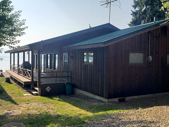 Well built home on this much sought-after location in Kalispell Bay on the West side of the lake. 50' of level sandy beach frontage. The panoramic views from the deck allows you to see up the lake and the islands. The open concept works well with the living/kitchen area with vaulted knotty pine ceilings & beautiful beams, leading out to a large wrap-around deck. Beautiful fireplace in the living room. This 3BD/2BA home is very solid on a flat level sandy beach lot, along with storage shed in back. On private well & community sewer. Nice composite dock with electric (solar) boat-lift. Furnished & ready to move it!