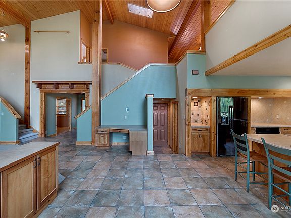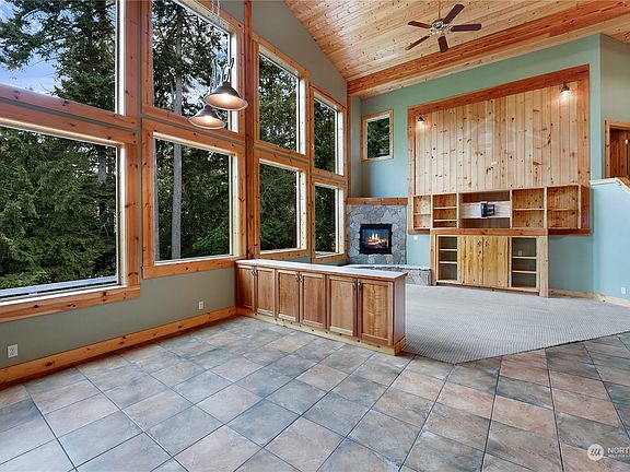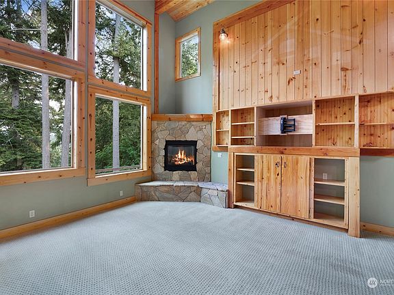 Incredible custom-built home nestled in the trees gives a chalet feel. Dramatic features include soaring 2 story vaulted wood ceilings, radiant heat flooring, double staircase, loft & bonus room overlooking the living room with stone fireplace, picture windows & built in entertainment center. Gourmet chef's kitchen with gas/griddle stovetop, double oven, coffee niche & bar seating for three. Office on main level, primary bedroom mid-level w/private staircase. Additional bedrooms, baths & extra multipurpose rooms on upper level. Expansive partially covered back deck is perfect for entertaining. 3 car garage w/workshop & large sauna plus room for toys. Leased land - Shelter Bay amenities include clubhouse, sports courts, beach access & more.