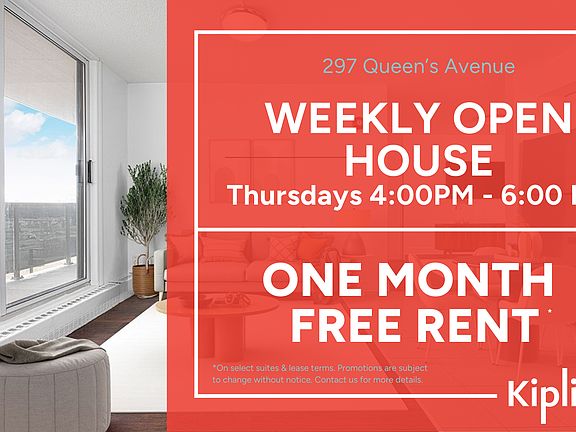 AboutReceive 1 Month Free Rent!*WeeklyOpen House Thursdays from 4:00PM - 6:00PMThe apartments at 297 Queens Avenue are nestled on a quiet cul-de-sac in a family-friendly neighbourhood of Oakvillejust minutes from Oakville Place, McCraney Valley Park, and the GO Station. This pet-friendly mid-rise combines modern style with practical amenities for daily ease:One-, two-, and three-bedroom layouts, all fully modernizedSuites feature new flooring, stainless-steel appliances, breakfast bars, and open-concept designs with expansive balconies for enhanced privacyShared laundry facility has been thoughtfully upgradedBuilding amenities include:On-site management teamUnderground and outdoor parking optionsDedicated Wi-Fi roomConvenient online resident portal for rent and maintenance requestsSuites are cable- and internet-ready, with modern cabinetry, backsplashes, hardwood floors, and pet-friendly policiesLocated just 5 minutes from Oakville Place Mall, 4 minutes to McCraney Valley Park, and 7 minutes to Oakville GO Station, 297 Queens Avenue offers a balanced blend of tranquility and connectivity.*On a 13-month lease on 1bdrm/2bdrm . Promotions are subject to change without notice. Contact us for more details. Offer for new residents only
