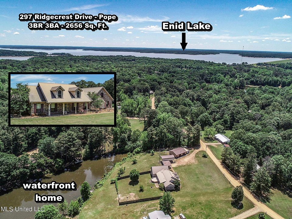 Waterfront home just five minutes from Enid Lake! Built in 2004, this home sits on an acre and a half with a fenced yard, private dock, covered RV storage, and a large garage workshop with double electric doors for vehicles, ATVs, or boat storage. The house has a metal roof, tiled porches and deck, and underground electricity. The spacious home has 9 foot ceilings, tile flooring in every room, stainless appliances, a huge master suite, a home office, and an oversized laundry room. Lots of great natural light and beautiful water views! All appliances are included, so it's ready and waiting to be the perfect weekend lake house or your forever home.