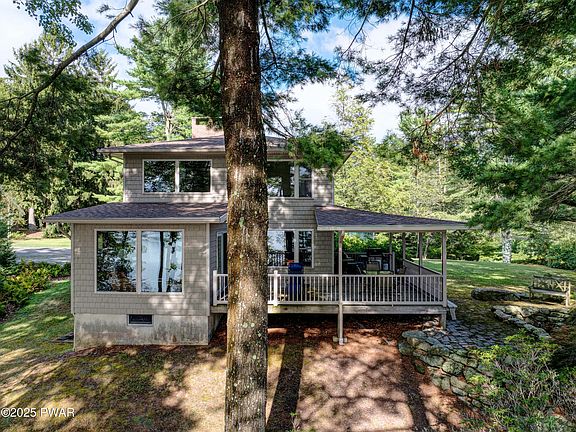 Fairview Lakefront Gem - Stunning Sunsets and Endless Amenities!Experience lakeside living at its finest on this beautiful Fairview Lake property, offering 100 feet of level frontage on one of the Poconos' most pristine natural glacier lakes--just 5 minutes from Lake Wallenpaupack.Inside, you'll find a thoughtfully designed layout featuring a galley kitchen, inviting living room with fireplace, and a bright sunroom perfect for soaking in the views. The main-level primary suite boasts a spacious bath, walk-in closet, and private access to a lakeside balcony. With 3 additional bedrooms, a loft, and 2.5 baths, there's room for everyone.Outdoor living shines here with a large, partially covered deck ideal for entertaining, a serene pond with waterfall, private dock, and your own tennis court. Whether you're hosting gatherings or enjoying quiet evenings watching the sunset over the water, this property offers a true retreat.
