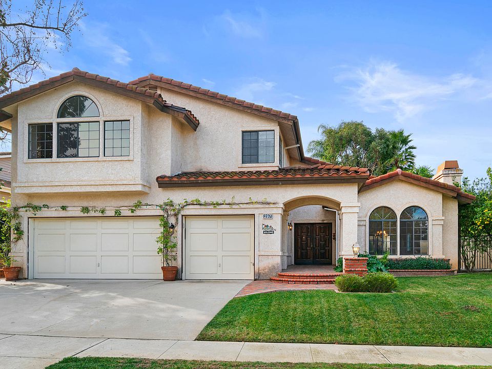Delightful 2-story 4 bedroom, 3 full bathroom, & 3,547 square foot home in the quiet hills of Wood Ranch! Step into the entry that leads you to the expansive dining and living room with wood floors, vaulted ceilings and cozy fireplace. The open & bright kitchen is the perfect space for the family gatherings, with a built-in cooktop and oven with a brick archway, plentiful cabinet space, & walk-in pantry. Just beyond the kitchen, the breakfast nook & family room invite you to relax by the second fireplace. Just past the family room, a downstairs bedroom, bathroom & laundry room with built-in cabinets are located next to the large 2-car garage access door. Walking up the elegant spiral staircase with inlay carpet, you are met with a built-in cabinet center. The master bedroom contains vaulted ceilings, a wood balcony, as well as walk-in closets. The enormous master bathroom shimmers with light, as dual skylights fill the pebble-tec floor. On the same floor, the two guest bedrooms are divided by an enormous gaming/entertaining room with built-in media center. The backyard beckons to you as an entertainer's paradise, with lush vegetation, built-in BBQ, & pebble-tec decking around a beautiful pool & spa.