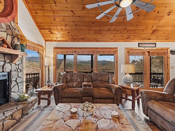 Turn-Key & Fully Furnished, this exceptional & highly popular short-term rental (sleeps 9) presents North Georgia luxury w/ million-dollar mountain views-all just 5 minutes from downtown Blue Ridge. Nestled on a private 3.72 acres, this cabin blends rustic elegance w/ modern comfort, offering relaxation, recreation & timeless beauty. With a whole-house Generac generator, a heated & cooled detached game room, & stunning craftsmanship throughout, this property delivers a complete mountain-living experience. The charm of this cabin is undeniable. Clad in classic log siding w/ warm rustic accents, the home welcomes you w/ an inviting covered front porch that sets the stage for the refined interior. Step inside to discover an airy living room where a stone fireplace w/ gas logs commands attention. Expansive windows showcase year-round vistas of the North Georgia Mountains, filling the space with natural light & breathtaking scenery. The beautiful kitchen is both stylish & functional, designed for everyday living & effortless entertaining. You'll find granite countertops, custom wood cabinetry, stainless steel appliances, & a dedicated coffee & wine bar-all arranged to maximize workspace & efficiency. Convenience w/ the primary bedroom located on the main level, offering comfort & privacy. Beyond the living room, a standout feature awaits: an expansive screened porch complete w/ a cozy swinging daybed & plenty of room for gatherings. Enjoy a morning coffee or host an evening dinner, this space is designed to savor the long-range views in total comfort. The terrace level extends the living area w/ a great room & stone fireplace. 2 guest bedrooms w/ a full bath, creating space for guests/family. Step out to the deck, the hot tub overlooking the views offers relaxation. Spaces throughout the property include: detached game room-currently a garage conversion-offers space for fun, games & hobbies and Outdoor spaces, a firepit, picnic pavilion & fenced area for the pups.