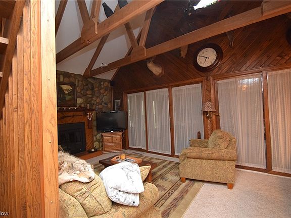 This cabin style-home on heavily wooded private land awaits a new family eager for memory-making get togethers. Cozy and homey, totally charming and inviting are apt descriptions. Private setting with seasonal lake views. Beautiful oak woodwork and two mesmerizing wood burning fireplaces, each with a stone feature wall and raised hearth. This home is beautifully maintained and totally charming, ready for your gatherings and family memory making. The seller's personal items, furnishings, photos, decor and memorabilia are not included in this offering.