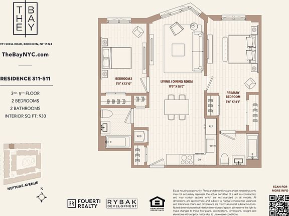 At The Bay, our two-bedroom apartments are designed for families and couples embracing new beginnings. These thoughtfully crafted homes balance luxury with functionality, offering ample space to grow and thrive in vibrant Coney Island. Kid-Friendly Amenities: Families will appreciate the dedicated outdoor play area and the indoor playroom, perfect for keeping little ones active and engaged year-round. Work and Relaxation Combined: Stay productive with the co-working lounge, featuring private office pods and high-speed Wi-Fi, and unwind on the rooftop lounge, complete with BBQ grills, cabanas, and panoramic views. Active Living: Maintain a healthy lifestyle with access to the state-of-the-art fitness center, Olympic-sized heated saltwater pool, and regulation pickleball court. Elegant Interiors: Scavolini Italian kitchens with high-end appliances, triple-glazed windows, and spa-inspired bathrooms with deep soaking tubs ensure every moment at home is luxurious. Smart and Spacious: In-unit washer/dryers, Wi-Fi smart locks, and custom modular closets offer unparalleled convenience for busy families. Nestled at 2971 Shell Rd, The Bay places you close to Coney Island's iconic boardwalk, top schools, and public transit, offering the perfect balance of excitement and ease. Whether you're working, playing, or simply enjoying time with your loved ones, The Bay is where life's next chapter begins. Welcome home. Required Fees: Application Fee: $20 per applicant. One Month Rent: Due at signing. One Month Security Deposit: Due at signing (Refundable) Utility Fees: All tenants are responsible for setting up a ConEd account prior to signing and for the associated utility fees based on usage Optional Fees: Please inquire about our pricing and fees related to our optional services including access to the Amenity spaces, Parking, Bike Storage, and tenant storage. *Photos may not be of actual unit but are meant for representational purposes only.