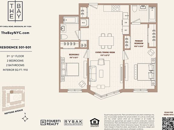 At The Bay, our two-bedroom apartments are designed for families and couples embracing new beginnings. These thoughtfully crafted homes balance luxury with functionality, offering ample space to grow and thrive in vibrant Coney Island. Kid-Friendly Amenities: Families will appreciate the dedicated outdoor play area and the indoor playroom, perfect for keeping little ones active and engaged year-round. Work and Relaxation Combined: Stay productive with the co-working lounge, featuring private office pods and high-speed Wi-Fi, and unwind on the rooftop lounge, complete with BBQ grills, cabanas, and panoramic views. Active Living: Maintain a healthy lifestyle with access to the state-of-the-art fitness center, Olympic-sized heated saltwater pool, and regulation pickleball court. Elegant Interiors: Scavolini Italian kitchens with high-end appliances, triple-glazed windows, and spa-inspired bathrooms with deep soaking tubs ensure every moment at home is luxurious. Smart and Spacious: In-unit washer/dryers, Wi-Fi smart locks, and custom modular closets offer unparalleled convenience for busy families. Nestled at 2971 Shell Rd, The Bay places you close to Coney Island's iconic boardwalk, top schools, and public transit, offering the perfect balance of excitement and ease. Whether you're working, playing, or simply enjoying time with your loved ones, The Bay is where life's next chapter begins. Welcome home. Required Fees: Application Fee: $20 per applicant. One Month Rent: Due at signing. One Month Security Deposit: Due at signing (Refundable) Utility Fees: All tenants are responsible for setting up a ConEd account prior to signing and for the associated utility fees based on usage Optional Fees: Please inquire about our pricing and fees related to our optional services including access to the Amenity spaces, Parking, Bike Storage, and tenant storage. *Photos may not be of actual unit but are meant for representational purposes only.