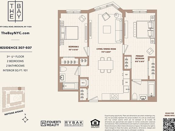 At The Bay, our two-bedroom apartments are designed for families and couples embracing new beginnings. These thoughtfully crafted homes balance luxury with functionality, offering ample space to grow and thrive in vibrant Coney Island. Kid-Friendly Amenities: Families will appreciate the dedicated outdoor play area and the indoor playroom, perfect for keeping little ones active and engaged year-round. Work and Relaxation Combined: Stay productive with the co-working lounge, featuring private office pods and high-speed Wi-Fi, and unwind on the rooftop lounge, complete with BBQ grills, cabanas, and panoramic views. Active Living: Maintain a healthy lifestyle with access to the state-of-the-art fitness center, Olympic-sized heated saltwater pool, and regulation pickleball court. Elegant Interiors: Scavolini Italian kitchens with high-end appliances, triple-glazed windows, and spa-inspired bathrooms with deep soaking tubs ensure every moment at home is luxurious. Smart and Spacious: In-unit washer/dryers, Wi-Fi smart locks, and custom modular closets offer unparalleled convenience for busy families. Nestled at 2971 Shell Rd, The Bay places you close to Coney Island's iconic boardwalk, top schools, and public transit, offering the perfect balance of excitement and ease. Whether you're working, playing, or simply enjoying time with your loved ones, The Bay is where life's next chapter begins. Welcome home. Required Fees: Application Fee: $20 per applicant. One Month Rent: Due at signing. One Month Security Deposit: Due at signing (Refundable) Utility Fees: All tenants are responsible for setting up a ConEd account prior to signing and for the associated utility fees based on usage Optional Fees: Please inquire about our pricing and fees related to our optional services including access to the Amenity spaces, Parking, Bike Storage, and tenant storage. *Photos may not be of actual unit but are meant for representational purposes only.