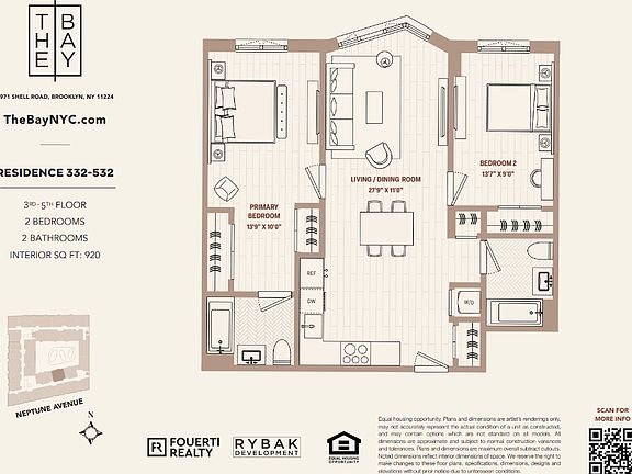 At The Bay, our two-bedroom apartments are designed for families and couples embracing new beginnings. These thoughtfully crafted homes balance luxury with functionality, offering ample space to grow and thrive in vibrant Coney Island. Kid-Friendly Amenities: Families will appreciate the dedicated outdoor play area and the indoor playroom, perfect for keeping little ones active and engaged year-round. Work and Relaxation Combined: Stay productive with the co-working lounge, featuring private office pods and high-speed Wi-Fi, and unwind on the rooftop lounge, complete with BBQ grills, cabanas, and panoramic views. Active Living: Maintain a healthy lifestyle with access to the state-of-the-art fitness center, Olympic-sized heated saltwater pool, and regulation pickleball court. Elegant Interiors: Scavolini Italian kitchens with high-end appliances, triple-glazed windows, and spa-inspired bathrooms with deep soaking tubs ensure every moment at home is luxurious. Smart and Spacious: In-unit washer/dryers, Wi-Fi smart locks, and custom modular closets offer unparalleled convenience for busy families. Nestled at 2971 Shell Rd, The Bay places you close to Coney Island's iconic boardwalk, top schools, and public transit, offering the perfect balance of excitement and ease. Whether you're working, playing, or simply enjoying time with your loved ones, The Bay is where life's next chapter begins. Welcome home.
