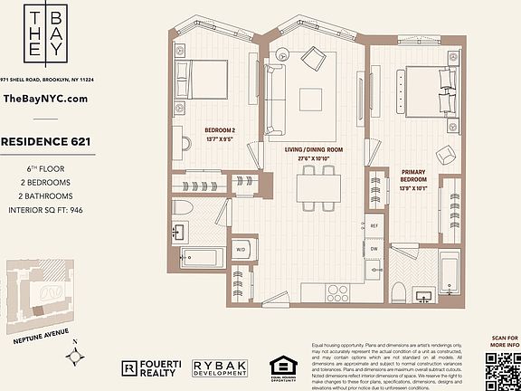At The Bay, our two-bedroom apartments are designed for families and couples embracing new beginnings. These thoughtfully crafted homes balance luxury with functionality, offering ample space to grow and thrive in vibrant Coney Island. Kid-Friendly Amenities: Families will appreciate the dedicated outdoor play area and the indoor playroom, perfect for keeping little ones active and engaged year-round. Work and Relaxation Combined: Stay productive with the co-working lounge, featuring private office pods and high-speed Wi-Fi, and unwind on the rooftop lounge, complete with BBQ grills, cabanas, and panoramic views. Active Living: Maintain a healthy lifestyle with access to the state-of-the-art fitness center, Olympic-sized heated saltwater pool, and regulation pickleball court. Elegant Interiors: Scavolini Italian kitchens with high-end appliances, triple-glazed windows, and spa-inspired bathrooms with deep soaking tubs ensure every moment at home is luxurious. Smart and Spacious: In-unit washer/dryers, Wi-Fi smart locks, and custom modular closets offer unparalleled convenience for busy families. Nestled at 2971 Shell Rd, The Bay places you close to Coney Island's iconic boardwalk, top schools, and public transit, offering the perfect balance of excitement and ease. Whether you're working, playing, or simply enjoying time with your loved ones, The Bay is where life's next chapter begins. Welcome home. Required Fees: Application Fee: $20 per applicant. One Month Rent: Due at signing. One Month Security Deposit: Due at signing (Refundable) Utility Fees: All tenants are responsible for setting up a ConEd account prior to signing and for the associated utility fees based on usage Optional Fees: Please inquire about our pricing and fees related to our optional services including access to the Amenity spaces, Parking, Bike Storage, and tenant storage. *Photos may not be of actual unit but are meant for representational purposes only.