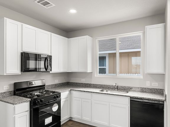 This charming home at 2971 Winding Creek Road offers 1,326 square feet of well-utilized space. So smartly laid out, it even offers a large storage closet in the entryway! The kitchen features 42-inch white shaker-style cabinets providing ample storage and a stylish touch. A large primary bedroom hosts an en-suite bathroom with a walk-in closet, walk-in shower and Silestone counters. Secondary bedrooms also provide walk-in closets with plenty of space. Windows over the kitchen sink, in the bathrooms, bedrooms, and throughout the living areas let natural light fill the home. Also enjoy great features such as an alley access lot with a detached 2-car garage, a rear covered patio, raised bathroom vanities, and wood-look vinyl through the main living areas. Full sod and a full sprinkler system allow for a low-maintenance yard. Located in Casetta Ranch, Kyle's award-winning community, you'll have access to a resort-style pool, playground, pickleball courts, and even a dog park. Don't miss your chance to own in one of Kyle's most desirable neighborhoods!