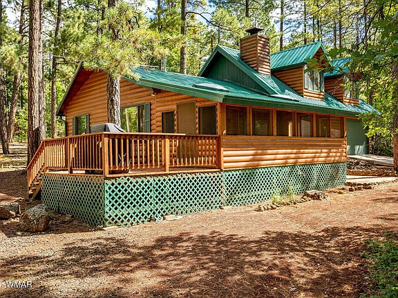 Come see this Quintessential Cabin in WMSH, Amazing 3 bed 3 bath recently updated & stained log cabin on over 1 ACRE lot in the guard gated community of White Mountain Summer Homes with garage and metal roof. Screened in porch with skylights to take in the mountain air or grill out among the tall pines on the newly added open deck. Inside the cabin boasts updated tile plank flooring, knotty pine walls, 2 dining areas, 42'' Oak cabinetry, Corian counters, new stainless-steel sink, stainless steel appliances, gas stove, updated lighting, main bedroom w/ added ensuite & guest bedroom & remodeled second bath downstairs, HUGE bunk room upstairs w/ full bath and vaulted ceilings. Cozy up to the living room/s stacked stone fireplace or access the French doors leading to the ENORMOUS lot for relaxing and games! Cabin has a newer metal roof with snow stops, oversized 1 car garage, large circular dive, recently updated water heater. Furniture available.