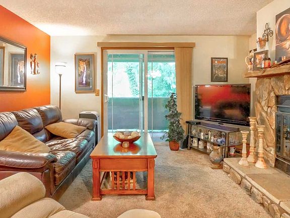 Beautifully updated condo in quiet complex with covered deck backing to private greenbelt. Gorgeous kitchen with updated cabinets, Bosch dishwasher, built in micro. Laminate floors and newer carpet and paint. Shower updated with tile and new plumbing and fixture. Brand new stackable Samsung W/D included. too. Too much to list. HOA $307/mo include: water, sewer, garbage, exterior maint. annual cleaning of chimney flue, FP and dryer vent