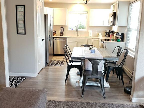 Clean, cute and efficient 1999 updated rancher on large corner lot. Kitchen remodel includes beautiful white cabinets with shaker style doors & drawer fronts and newly refinished stunning white epoxy counter tops. New flooring throughout. 2 car garage and privacy fenced back yard with shed.