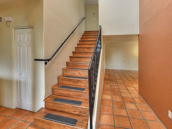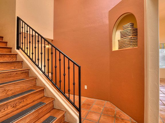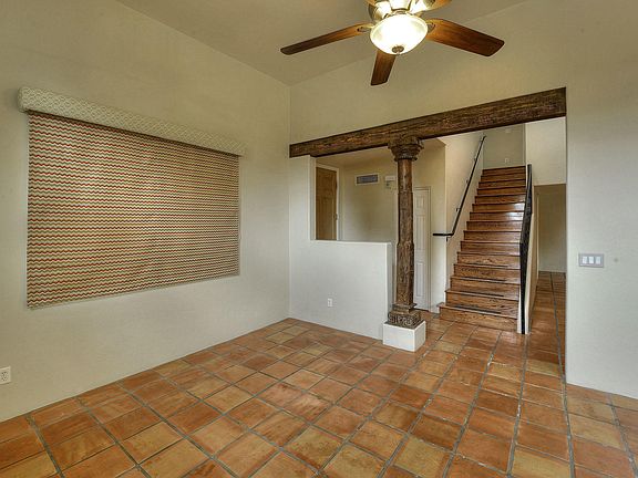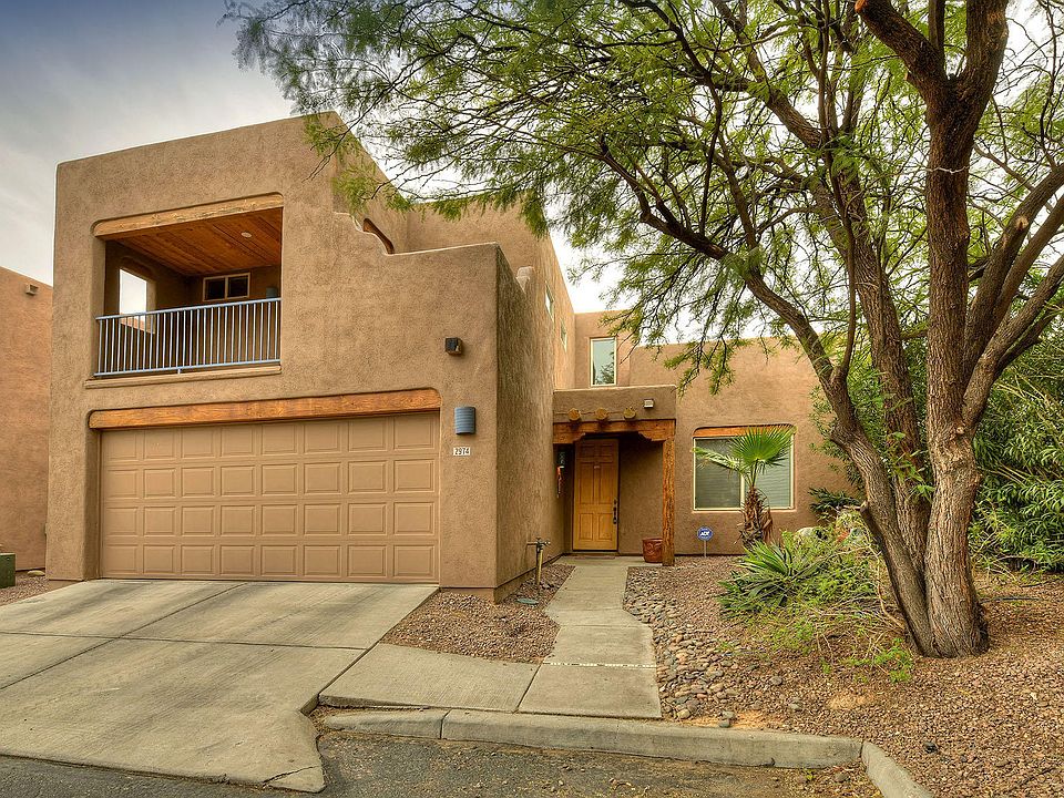 Spacious contemporary Santa Fe 1750 SF, 3 bed/2.5 bath, 2 story in small Camp Lowell/Columbus area enclave. Covered portico entry, soaring ceilings, carved post in entry, wood stairs and landing to second floor. Living room+adjoining dining area have high, clear story windows. Saltillo tile floors 1st floor. Well appointed kitchen-granite counters,SS appliances, pantry-adjoining family room with back yard access. Master bedroom has covered balcony w/ remarkable Catalina Mountain views. Ensuite bath has 2 sinks and doored access to shower+toilet, walk in closet+add'l. Back yard offers a walled, verdent oasis. Brick pavers, shaded patio, soothing fountain. Minutes to Rillito River Walk, YMCA, Camp Lowell/Swan shops/restaurants, and Smithsonian member Miniature Museum. Easy routes to UA/UMC