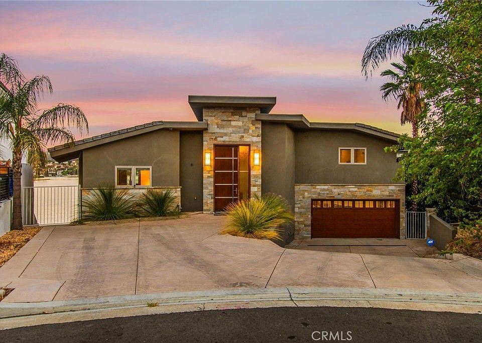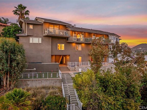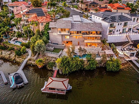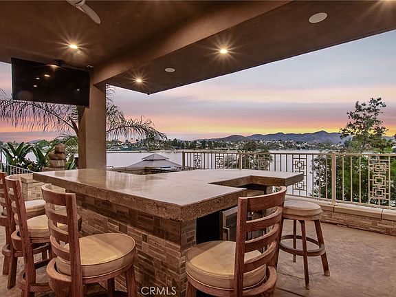 Experience contemporary waterfront living at its finest in this stunning 5,171 sq. ft. home, perfectly positioned on a premium ¼-acre main lake lot offering some of the most panoramic views in the entire community. From the moment you enter through the grand 10-foot solid mahogany door with stainless steel accents, you're welcomed by a dramatic foyer and a breathtaking wall of windows framing unobstructed views of the lake, beach, and surrounding hills. The main level offers an expansive open-concept design ideal for entertaining, with elegant lighting fixtures, chandeliers, blackout shades, and a built-in bar complete with a dumbwaiter to the lower level. Enjoy multiple flexible living areas for dining, relaxing, games, and media, all enhanced by a floor-to-ceiling stacked stone fireplace and a central theatre-quality whole-home audio and intercom system. The chef’s kitchen boasts custom hardwood cabinetry, quartz countertops, stainless steel appliances, and abundant storage. Two bedrooms and two full bathrooms complete the main level, along with a nearly full-width deck—perfect for taking in breathtaking SoCal sunrises and sunsets. The mid level hosts the luxurious primary suite with lake views directly from bed, oversized sliders opening to a private balcony, and a spa-like bath with dual vanities, soaking tub, walk-in shower with custom tile, and a spacious walk-in closet with built-ins. Two additional bedrooms with vaulted ceilings and walk-in closets offer more lake views, along with a full guest bath, a laundry room, and a versatile flex space currently used as an Escape Room. There is also direct access to an oversized 2+ car garage. Outdoor living is where this property truly shines, offering a lakeside putting green, pebble-tech pool and spa, a fully equipped outdoor kitchen with BBQ, sink, and concrete bar island, a private cabana, cozy firepit lounge, and a detached ¾ bath with an additional guest bedroom. Your private boat dock includes a hydrolift and fun waterslide—all tucked into a beautifully landscaped space designed for privacy and year-round enjoyment. This is lakefront luxury living at its best. Canyon Lake living offers a 400 acre waterski/fishing lake, 16 parks most with beaches and playsets, basketball, baseball, pickle ball, equestrian center, 18 hole golf course, pools, dog park, BMX pump track, golf cart friendly streets, slalom course, ski jump, restaurants, miles of hiking/biking/horse trails, community events and so much more!