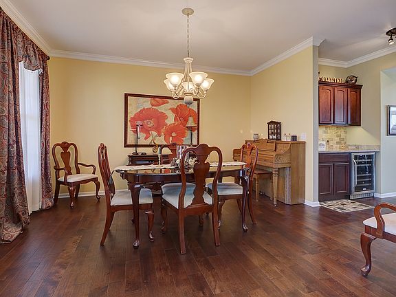 Gorgeous Grande Reserve beauty. This home offers a brick front, porch and new front door! Hardwood floors and 9 ft ceilings throughout the 1st floor. Spacious living room, dining room with crown molding and butlers pantry with wine refrigerator. Open kitchen concept with custom cabinets, roll out drawers, granite countertops, island, SS appliances, eat in area all opening to family room. 1st floor den or use as 5th bedroom. Owners suite with sitting area, trey ceilings, luxury bath, sep shower, tub, walk in closet. 3 other spacious bedrooms. Full basement with roughed in plumbing ready to finish. Paver patio complete with grill, bar and fire pit all backing to open area. New roof 2019, Clubhouse, pool, bike/walking paths, parks, sports fields all here. Close to Elementary school in subdivision.