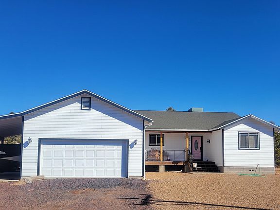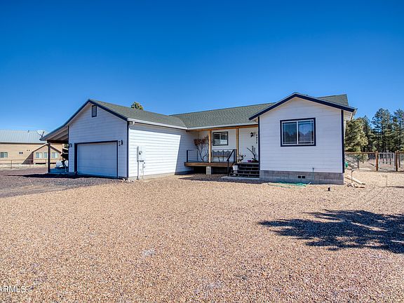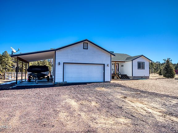 This place is SPECIAL!! Custom built 3 bedroom, 3 bath, on 2+ acres backing to forest & Buckskin Wash. No neighbors behind just the occasional wildlife passing through. Nearly 1700 gorgeous sqft custom home in a wonderful area & easily accessible on a private road with NO traffic. Fantastic neighbors & next door are rarely there. High end finishes throughout include tongue & groove ceilings, quartz countertops, custom cabinetry with loads of storage drawers behind the island! Solid wood doors throughout, no carpet, double sash windows, central AC w/heat in addition to a stacked stone fireplace w/wood insert. Attached oversized 2 car garage w/RV carport & full hookups, extra electrical added in garage & finished floor. Home has clean-out for easy winterizing. Fenced yard, professional watering system. Hot water heater is new, all systems routinely serviced. Walk in pantry, laundry room features utility sink & cabinets, ample closet space throughout home. Master & one secondary bedroom feature an en suite bathroom! Covered deck runs the entire length of the back of the home with another covered patio in front, both have new modern cable railing. Exterior paint just a couple years old!