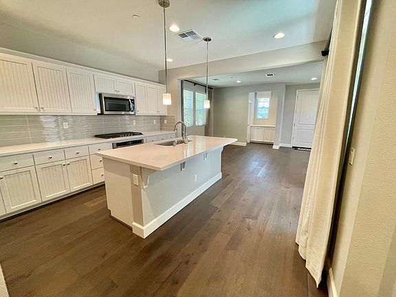 The kitchen features quartz countertops, tile backsplash, as well as stainless steel appliances including range, refrigerator, microwave, and dishwasher. The kitchen also features a large island with bar seating.