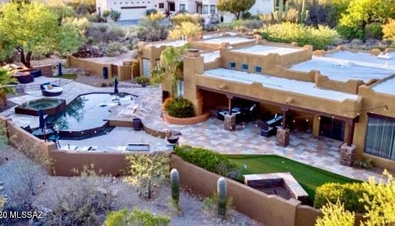 Work from home in your inspiring, window-lined home office with fireplace and soaring ceiling! Relax and unwind in this private resort, experiencing gorgeous sunsets and city lights from a beautifully conceived patio with glamorous pebble tec infinity edge pool, spa, water feature, putting green, and sunken outdoor kitchen--or dine alfresco on the long beamed porch which includes a beehive fireplace for cooler evenings. A paved driveway with ample parking for guests leads to the gracious entry patio with Catalina mountain views. The 3200 sf home includes bright kitchen and family room spaces, a formal dining room, 4 bedrooms, 2.5 baths. The location is ideal with great schools, upscale shopping, restaurants and easy access to the UA and downtown.