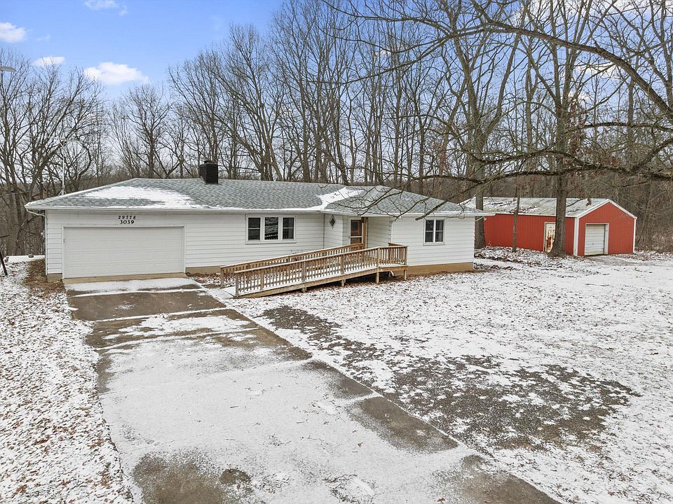 Rare opportunity to own this 3-bedroom, 2-bath one-story home situated on 40 stunning acres! This home features a cozy fireplace in the living room, a kitchen with a bar overhang, and the convenience of laundry rooms on both the main level and in the full unfinished basement. The den area boasts a wood-burning stove for added warmth and charm. Enjoy the outdoors year-round with a sunroom and a screened-in porch. Hardwood flooring adds timeless appeal in the bedrooms. The property also includes a 2-car attached garage and a 24 x 42 pole barn, perfect for storage or hobbies. A true retreat for nature lovers—don't miss out!