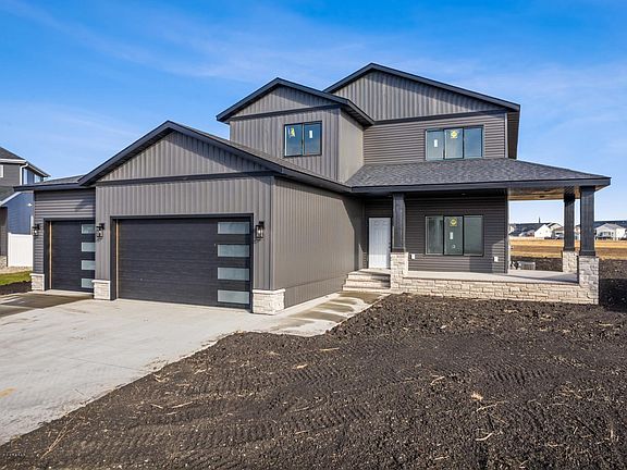 This stunning new home is waiting for you! This newly built custom home in South Fargo is nearly complete and could be yours as in as soon as 60 days! This beautiful new home is situated on a huge 1/2 acre lot with no backyard neighbors! You are sure to love the wrap-around-porch in the front of the home and the covered patio in the back of the home. The inside of the home is also loaded with tons of upgrades. Features inside include an office, double volume ceilings in the great room, a custom kitchen, open floor plan, a huge primary suite with private bath and walk-in-closet, a soaker tub, custom tile shower with dual shower heads, a bar, a fireplace, a gym, and so much more! Call for a private tour today! (Interior pictures are from a previous model)(owner/agent)