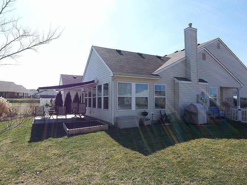 Feel right at home in this spacious 2 Br, 2 full bath w/cathedral ceilings throughout. Extrememly clean home, has an office with french doors with built-in bookshelves. Enjoy the gas fireplace in the Great Room. Huge tiled sun room overlooks the professionally landscaped yard which is completely fenced in the back. Relax on the 17x12 concrete patio that features an electric awning that automatically retracts in windy conditions. Totally maintained community, priced under competition. Must See!!!